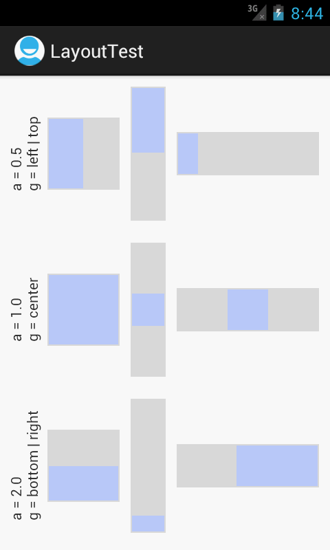 The child layout can be a single view or a complex layout. The FixedAspectLayout itself can be positioned as any other view, so you might for instance use a gravity to center it within its parent. Keep in mind that if your layout is dynamic like mine was, you may not know in advance if there is going to be excess horizontal or vertical space, so you may want to specify both a horizontal and vertical alignment.